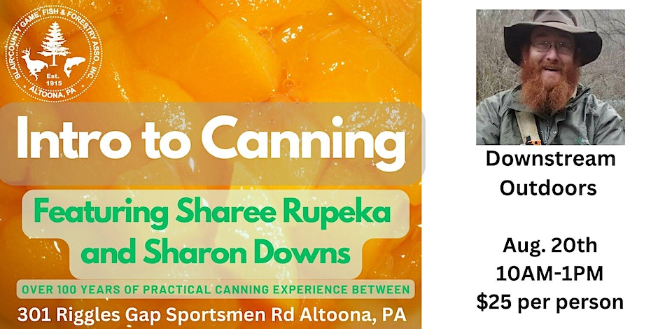 Learn the basics of canning peaches from Sharee Rupeka and Sharon Downs. You will take home a previously prepared jar of peaches. Learn the styles of water bath and pressure canning. All proceeds will be split between Blair County Game, Fish and Forestry Association and The Keystone Sportsman for Youth.