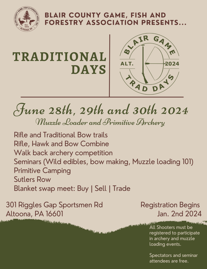 Coming on June 28th, 29th and 30th in 2024. We are planning a trip back in time to traditional shooting. Muzzle loaders and traditional bows will be coming out in force. Registration begins in January but we are currently looking for vendors appropriate for the event. Check out all the details and updates at www.traddays.com. Vendors can register HERE!