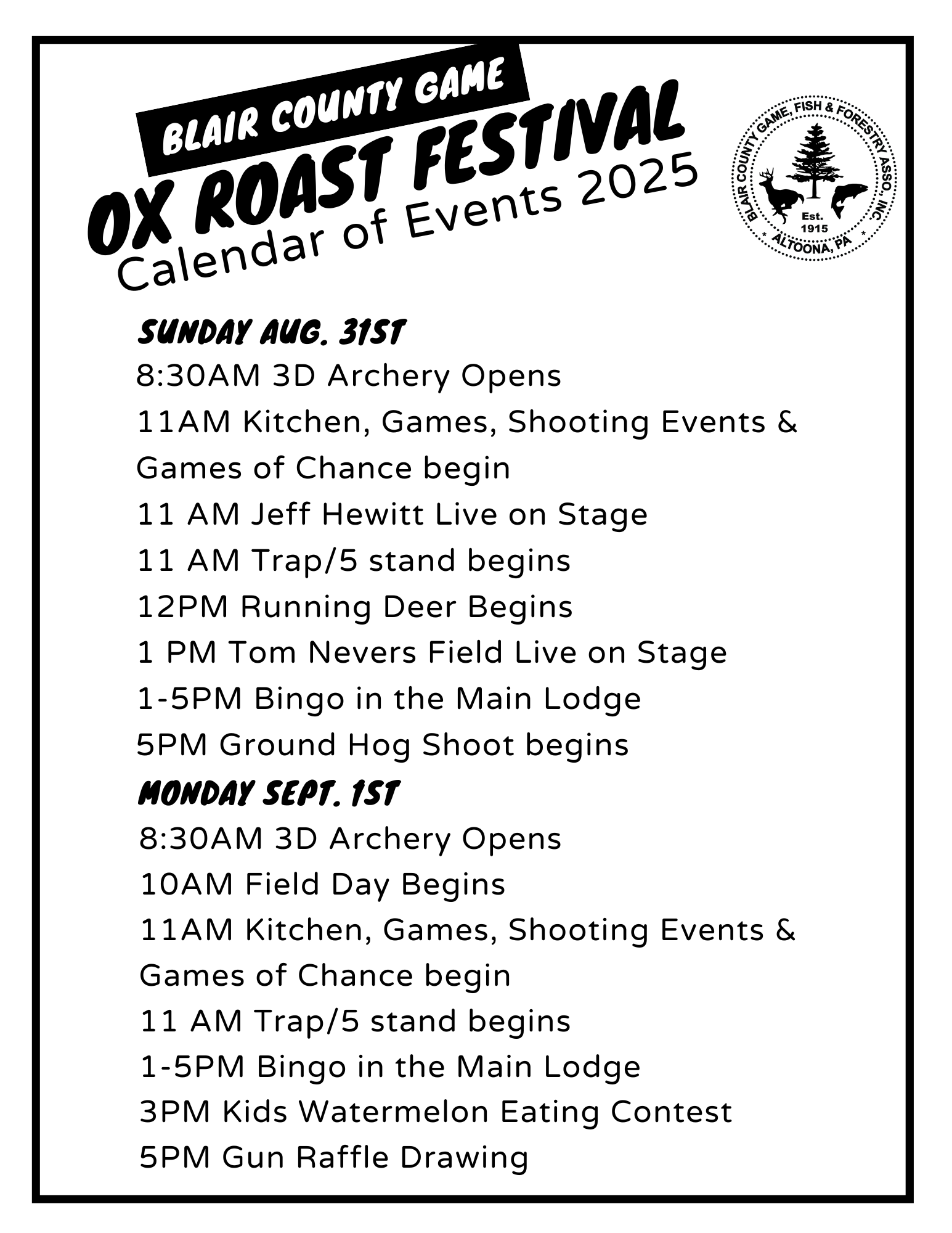 Front PageOX Roast Festival! We are excited to have our 78th annual Ox Roast Festival. Check out all the events and vendors we have scheduled! August 31st and Sept. 1st. Share this: Click to share on X (Opens in new window) X Click to share on Facebook (Opens in new window) Facebook Like Loading...