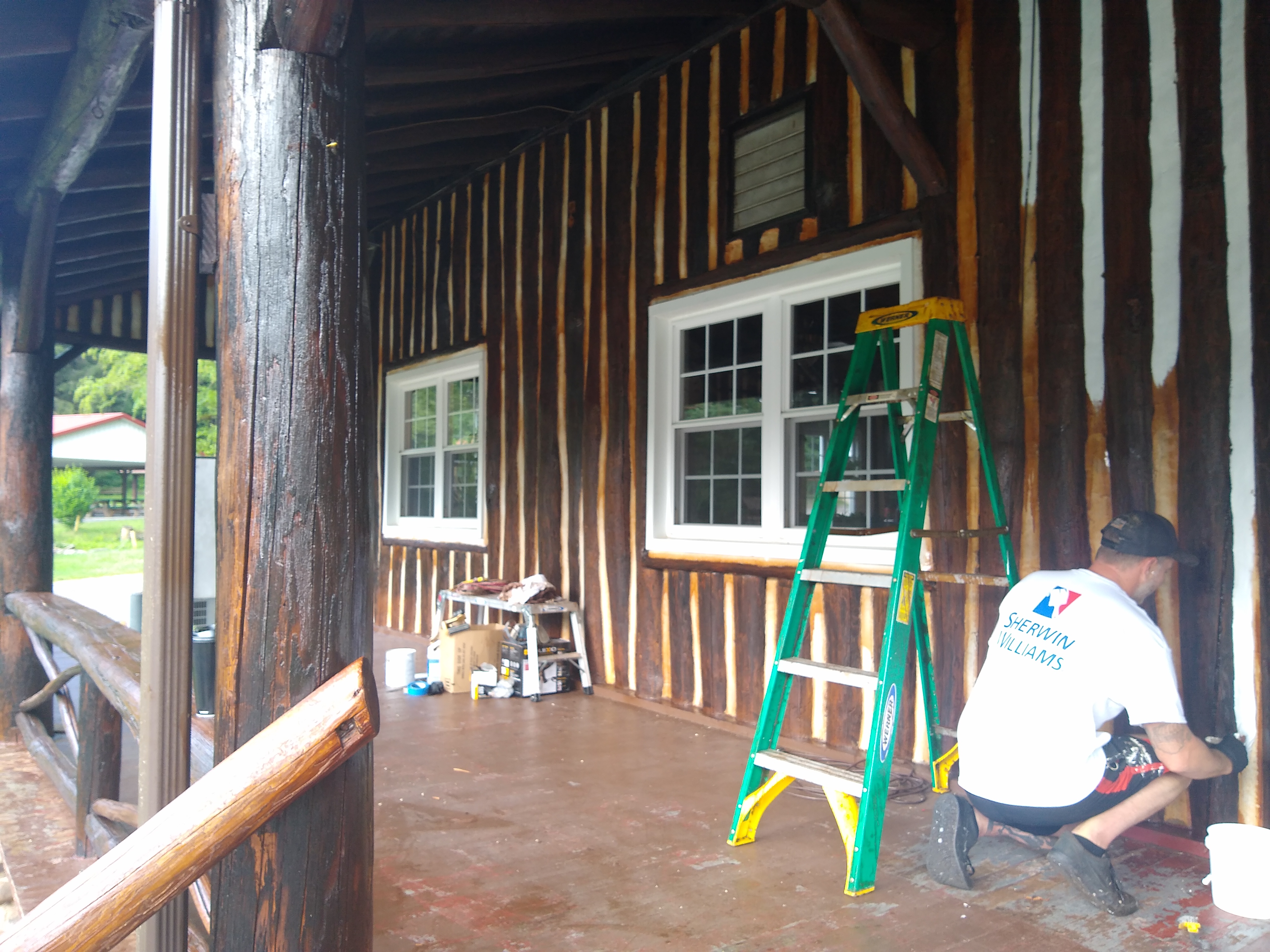 The next step was to stain every exposed piece of wood on the outside of the building. As well as hire another contractor to install chimney caps on all the chimneys. These two very important steps will protect the lodge for many years.